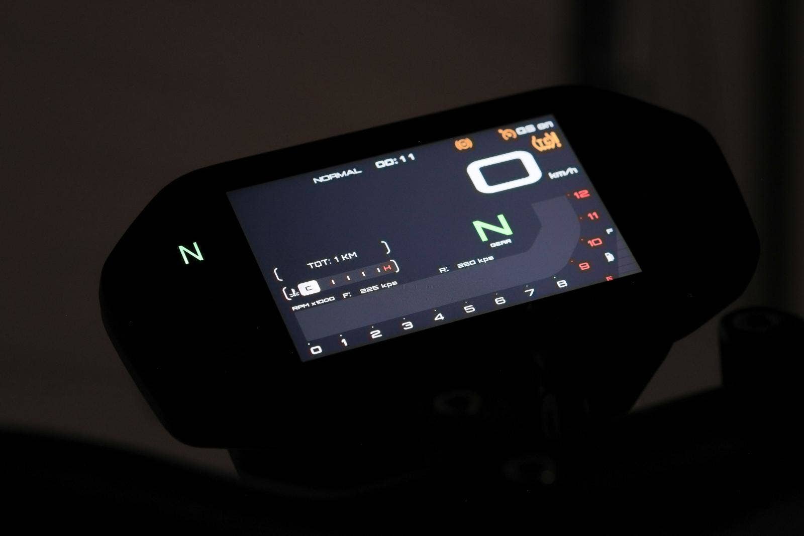 Digitální přístrojová deska SRK 800 je vizuálním a technickým srdcem kokpitu. Tento velký barevný TFT displej zobrazuje velké množství informací, je snadno čitelný ve dne i v noci a umožňuje Vám snadno upravit si motocykl přesně pro sebe. Kromě toho má schopnost propojit se s mobilním telefonem jezdce, s možností zobrazení navigace, která zobrazuje i aktuální provoz, nebo také umožňuje zrcadlit obrazovku Vašeho mobilního telefonu. Dále přístrojový panel umožňuje spravovat a prohlížet si příchozí hovory.